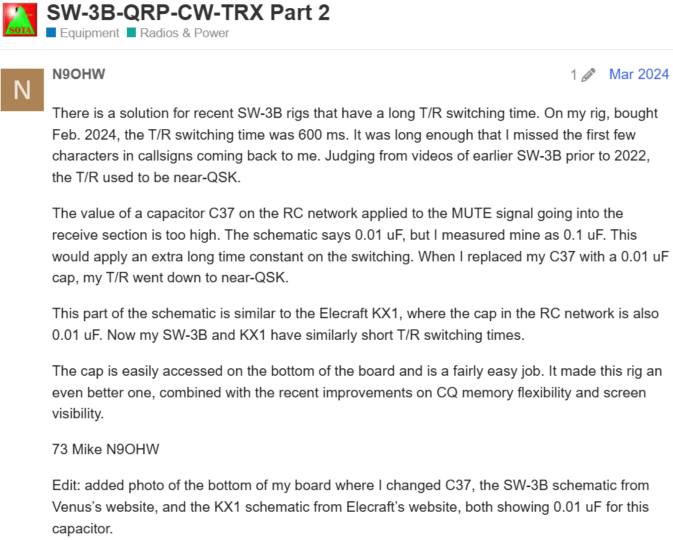 最近のSW-3B無線機でT/R切り替え時間が長い問題に対する解決策があります。2024年2月に購入した私の無線機では、T/R切り替え時間が600ミリ秒でした。この遅さのため、応答コールサインの最初の数文字を聞き逃すことがありました。2022年以前の初期型SW-3Bの動画から判断すると、かつてのT/R切り替えはほぼQSKに近い状態でした。
