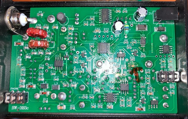 追記:C37を変更した基板裏面の写真、Venusウェブサイト掲載のSW-3B回路図、Elecraftウェブサイト掲載のKX1回路図を追加。いずれもこのコンデンサは0.01μFを示している。